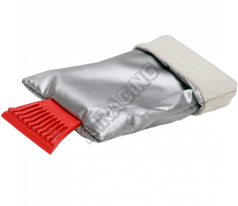Škrabka s plastovým břitem v kombinaci s textilní rukavicí. Zamezuje prochladnutí ruky při čištění zamrzlého skla. Vnitřní strana rukavice s kožíškem. Materiál plast + textil.
