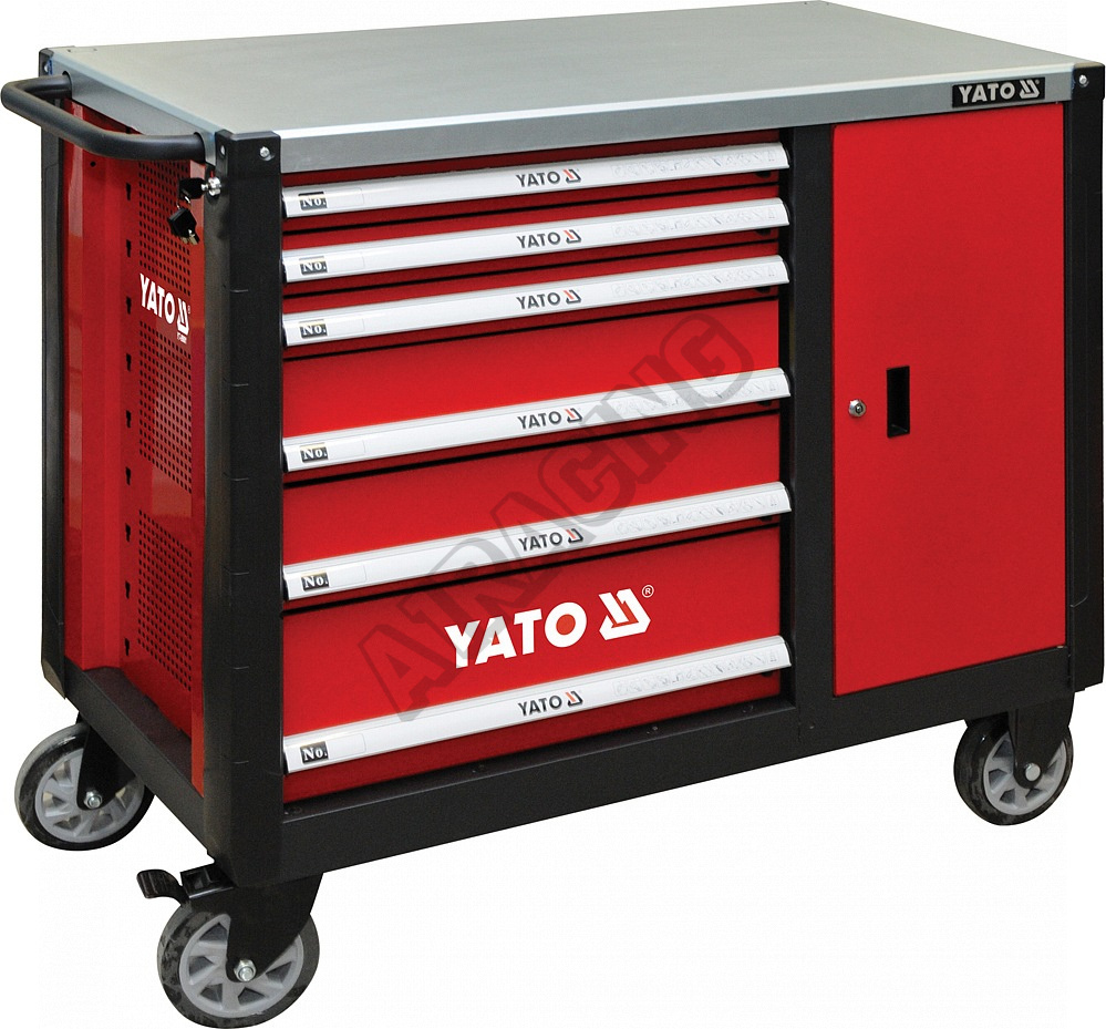 Dílenská skříňka značky YATO, vybavena uzamykatelnou skříní a 6x zásuvkami s kuličkovými ložisky a centrálním zamykáním.