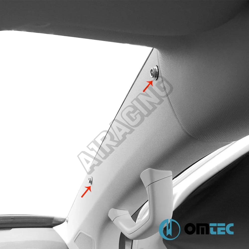 Uchyceni je zde pomocí magnetů, které drží na kovových krajích bočních oken a na předním okně je třeba použít do bočních části 6 malých cvoků, které se pevně musí přišroubovat.