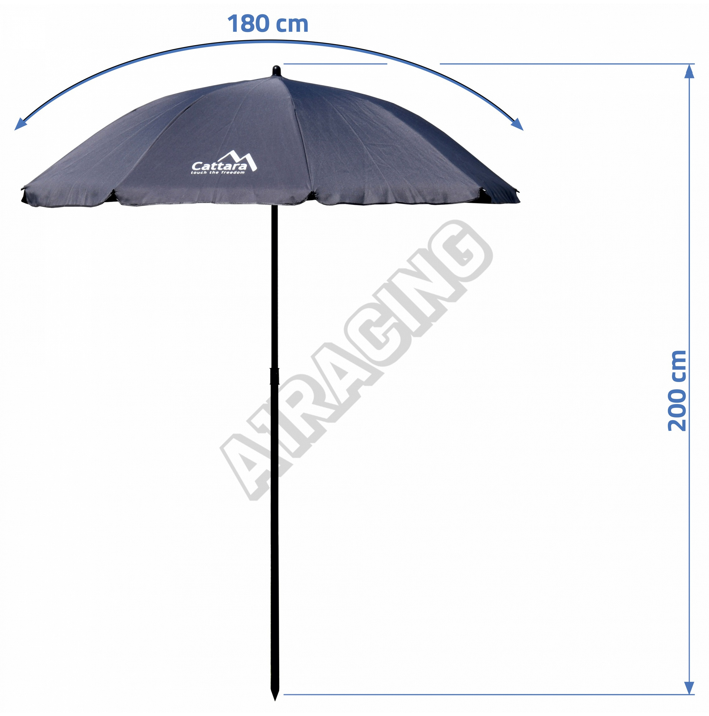 Délka „poloměru“ slunečníku je 180 cm a celková výška 200 cm. Dvoudílná konstrukce je skladná a lehce složitelná. Stačí do sebe zasunout obě nosné tyče a zajistit páčkou. Poté již stačí jen roztáhnout samotný slunečník. Konstrukce slunečníku má špičaté zakončení, takže je vhodná pro zapíchnutí do země.