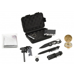 SOS sada je složena ze zavíracího nože s čepelí délky 6,5 cm, multifunkční karty, píšťalky, kompasu s otočnou stupnicí, bivakovací (izotermické) fólie, rozměrného křesadla pro zapálení ohně, přívěškem s LED osvětlením, celokovovým perem s průrazným hrotem a LED svítilnou napájenou AA baterií (není součástí balení) s nastavitelným kuželem vysoce výkonného světla. Vše je uloženo v ochranném, uzavíratelném pouzdře.