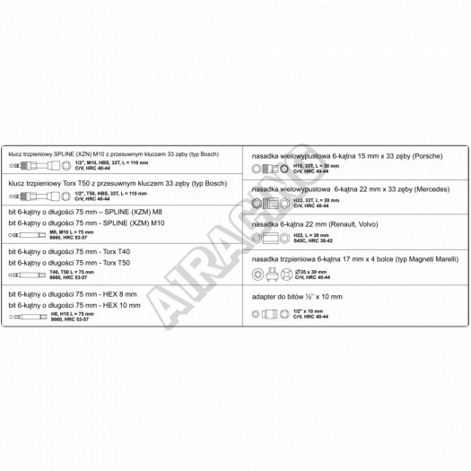Sada je použitelná pro alternátory typu Bosch a Magneti Marelli a pro automobily značek Audi, BMW, Fiat, Ford, Mercedes, Opel, Porsche, Renault, Peugeot, Seat, Škoda, Volvo, VW a další.