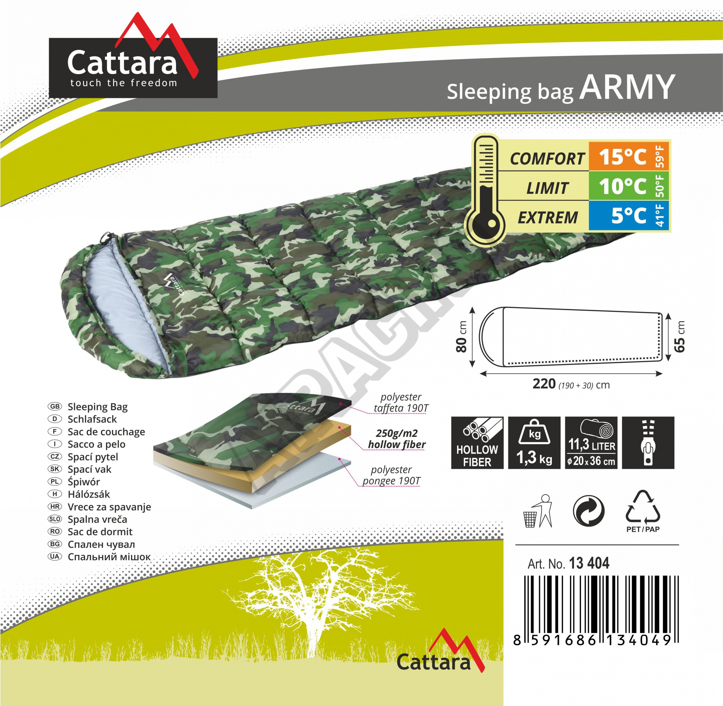 Nejširší uplatnění však najde jako lehce přenosný spacák, to je zajištěno jeho malými rozměry v balení pouhých 20 x 36 cm. Spacák Army je vybaven třemi vrstvami, vnější a vnitřní materíál je polyester taffeta 190T a izolační vrstva polyesterová dutá vlákna s gramáží 250g/m2.
