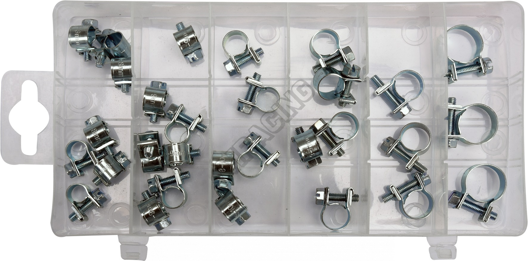 Sada 30 ks univerzálních spon, pro hadičky, kabeláž apod. Vše je přehledně uspořádáno v kompaktním p