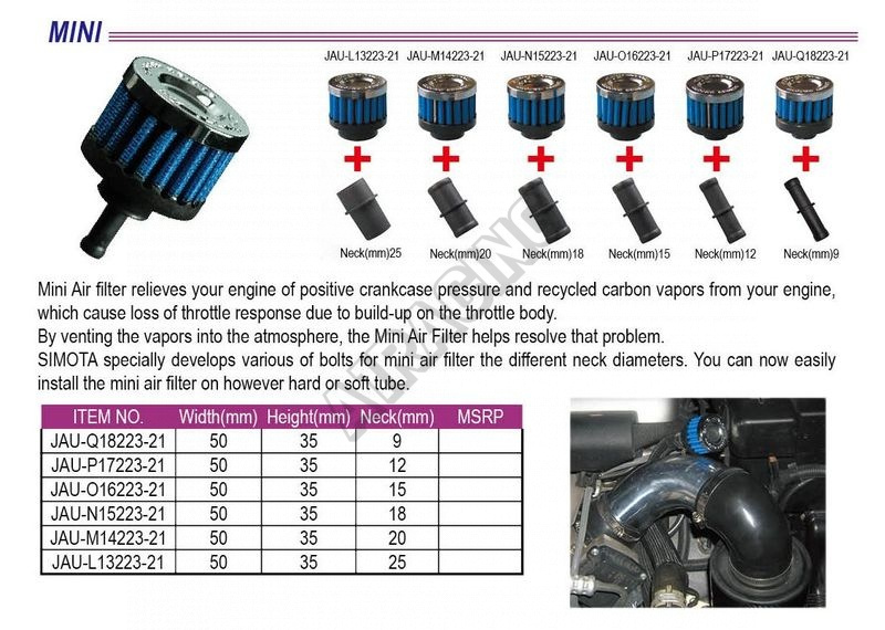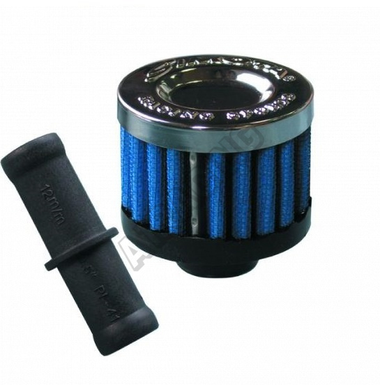Sportovní oddechový filtr SIMOTA – průměr vstupu 12mm, 18mm nebo 25mm, materiál bavlna. Oddechový filtr zbavuje váš motor přetlaku v klikové skříni a odvětrá přebytečné páry z motoru, které způsobují ztráty reakce na plyn. Odvětráním filtr pomůže tento problém vyřešit. K dispozici pro lepší montáž nabízíme různé průměry vstupu, vhodné k montáži jak na tvrdé tak měkké trubky. Filtr můžete udržovat speciální čistící sadou a tím lze použít opakovaně. Vyznačuje se dlouhou životností.
