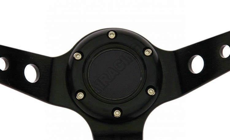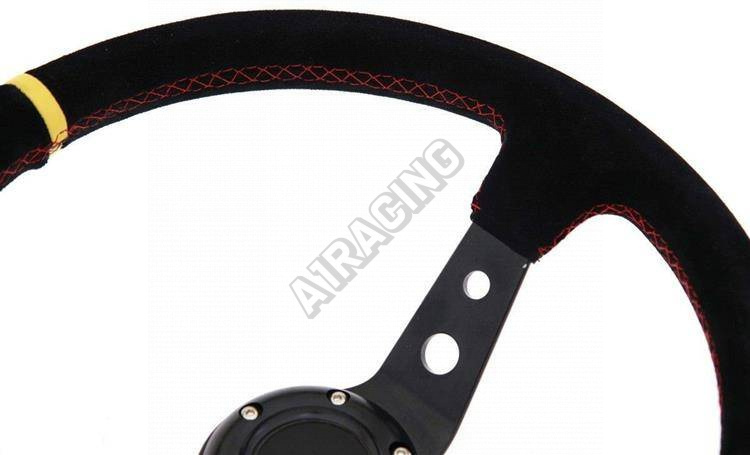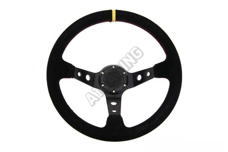 Kvalitní sportovní volant WRC ve sportovním semiši jako mají závodní auta, určeno pro standartní 6 děrovou nábu o průměru 70 mm, střední část volantu o proti krajní je utopená o 80 mm.