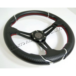 Kvalitní sportovní volant z umělé kůže, určeno pro standartní 6 děrovou nábu o průměru 70 mm, střední část volantu o proti krajní je utopená o 70 mm.