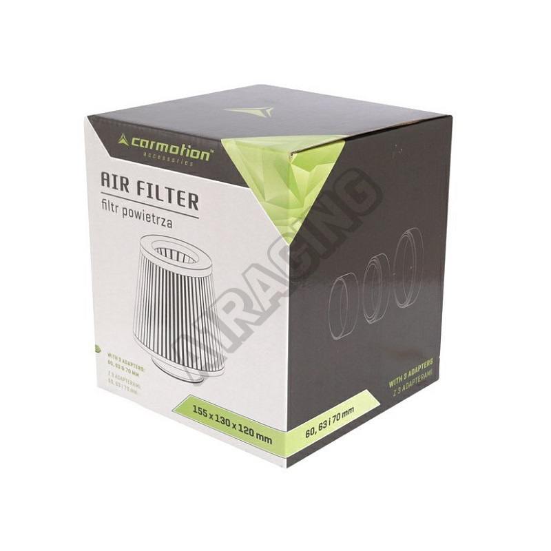 Kónický vzduchový filtr, velikost 155 x 130 x 120 mm, vyrobený s bavlnou, který je potažen síťkou s nerezovou ocelí. Dlouhá životnost je Zajištěná čištěním a údržbou. Díky dalšímu adaptéru můžete filtr přizpůsobit dvěma automobilům.
