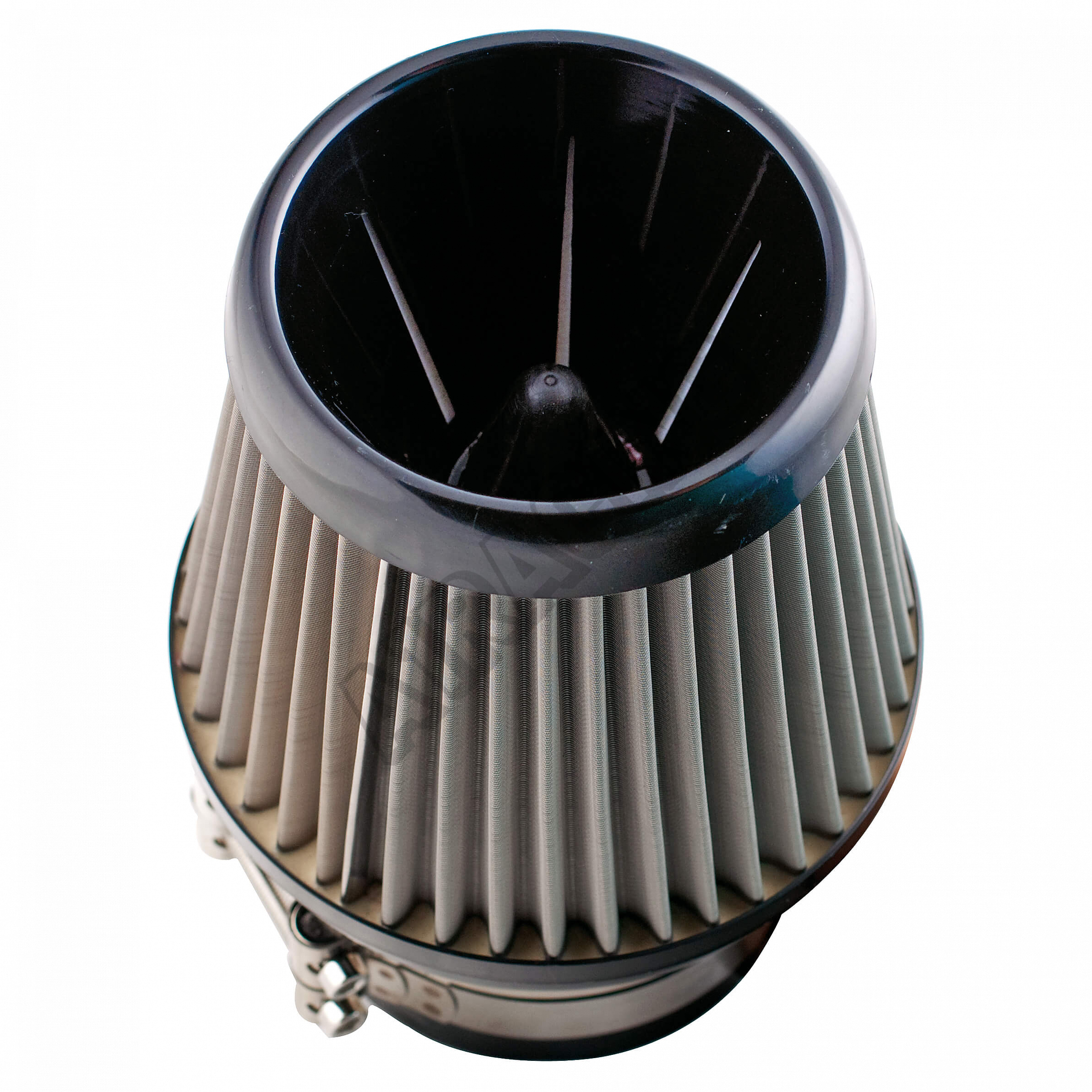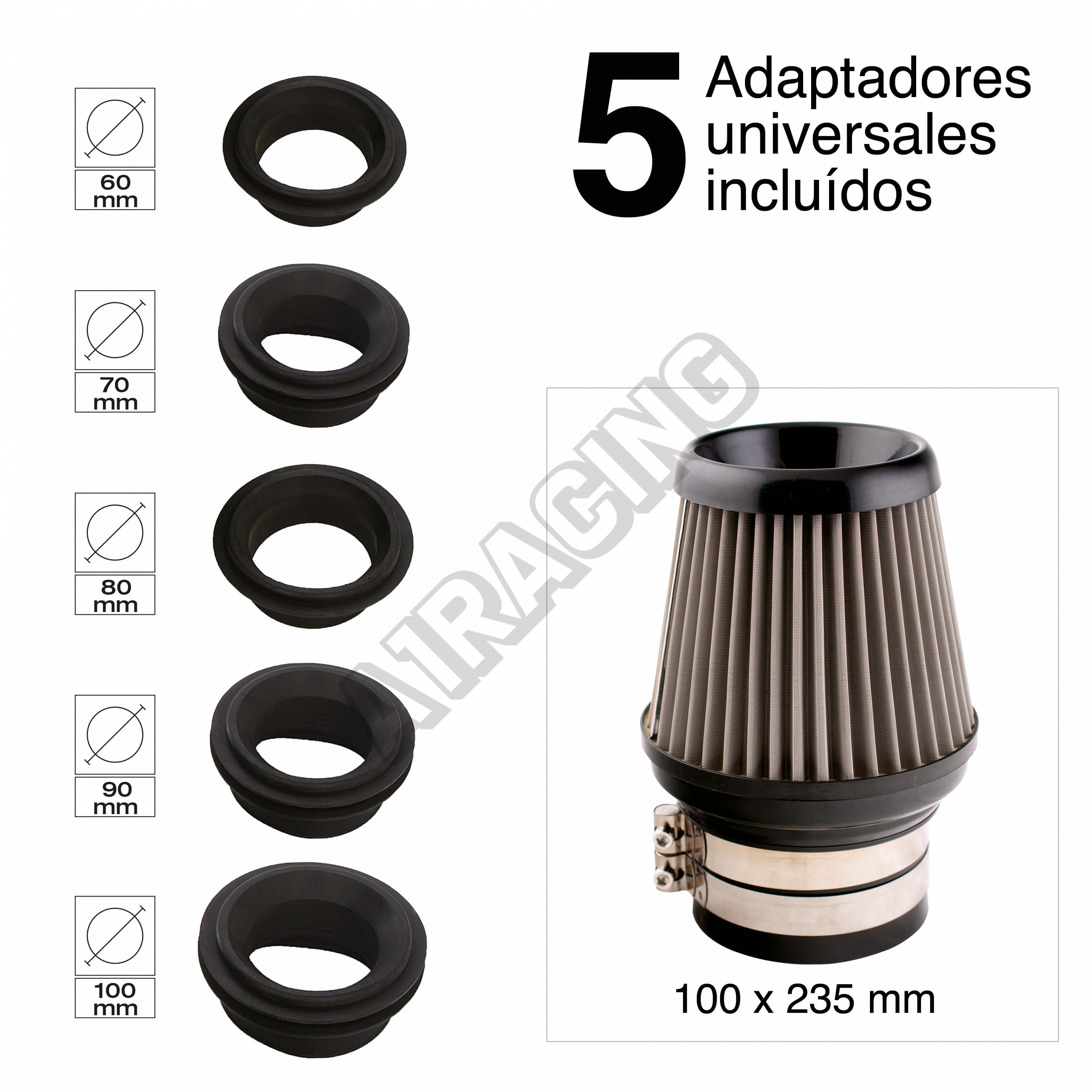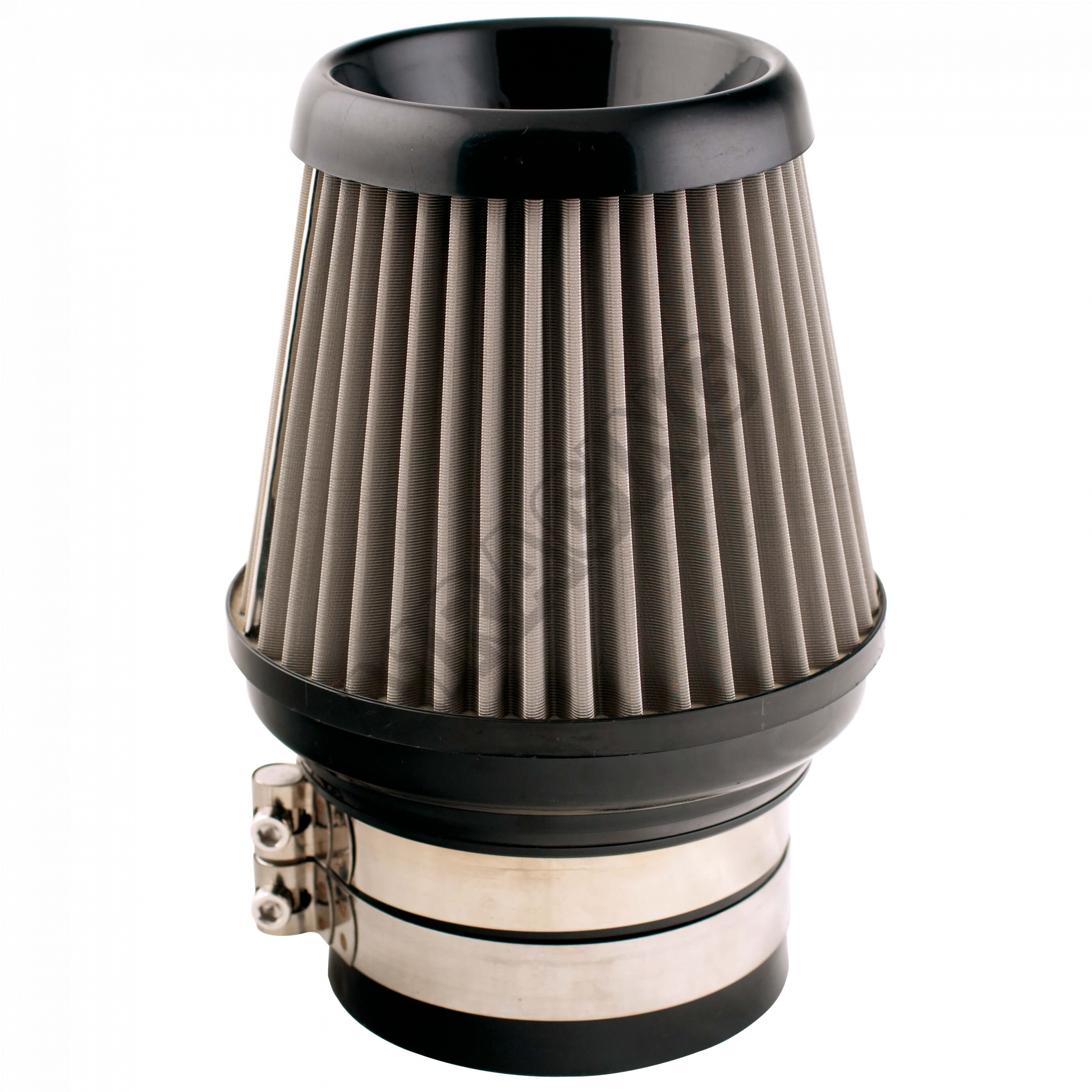 Universální sportovní vzduchový filtr kuželový - filtrace je z jemného nerez drátu. Zlepšuje proudění vzduchu, decentně způsobuje zvýšení výkonu a také zlepšuje sportovní zvuk motoru. Vyznačuje se dlouhou životností. Instalace na sponu je velmi jednoduchá Rozměry: Výška - 235 mm Šířka spodní - 165 mm Šířka horní - 155 mm, průměr pro nasazení 100, 90, 80, 70 a 60 mm (5 adaptérů)