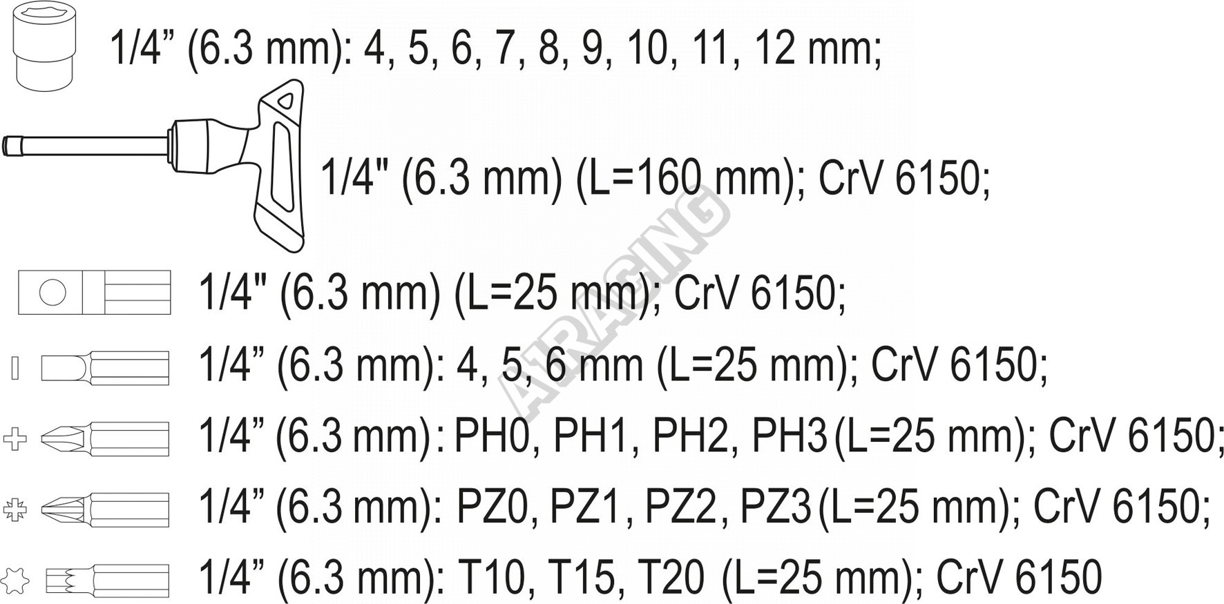- 3x bit Torx: T10; T15; T20 (25 mm)