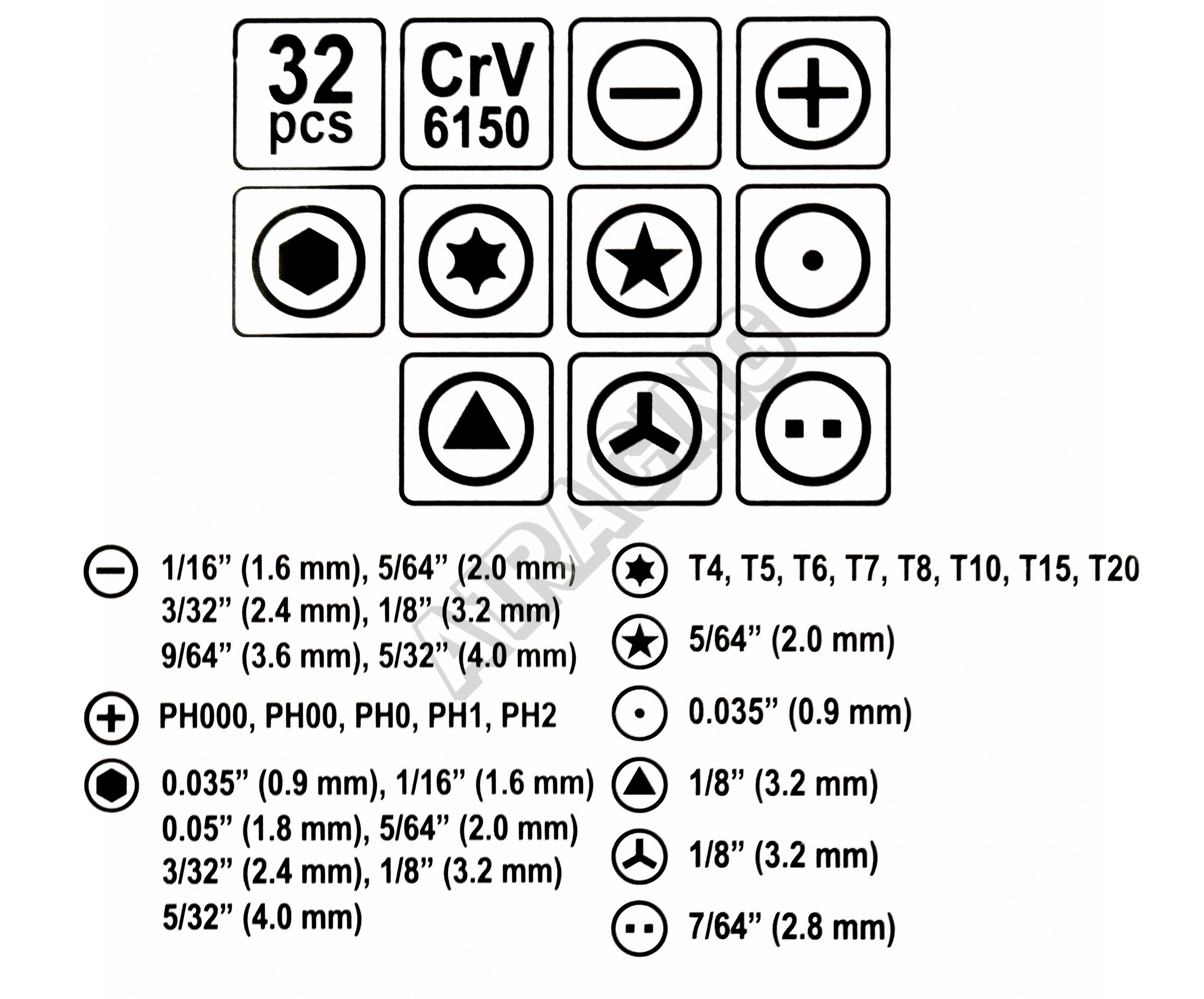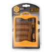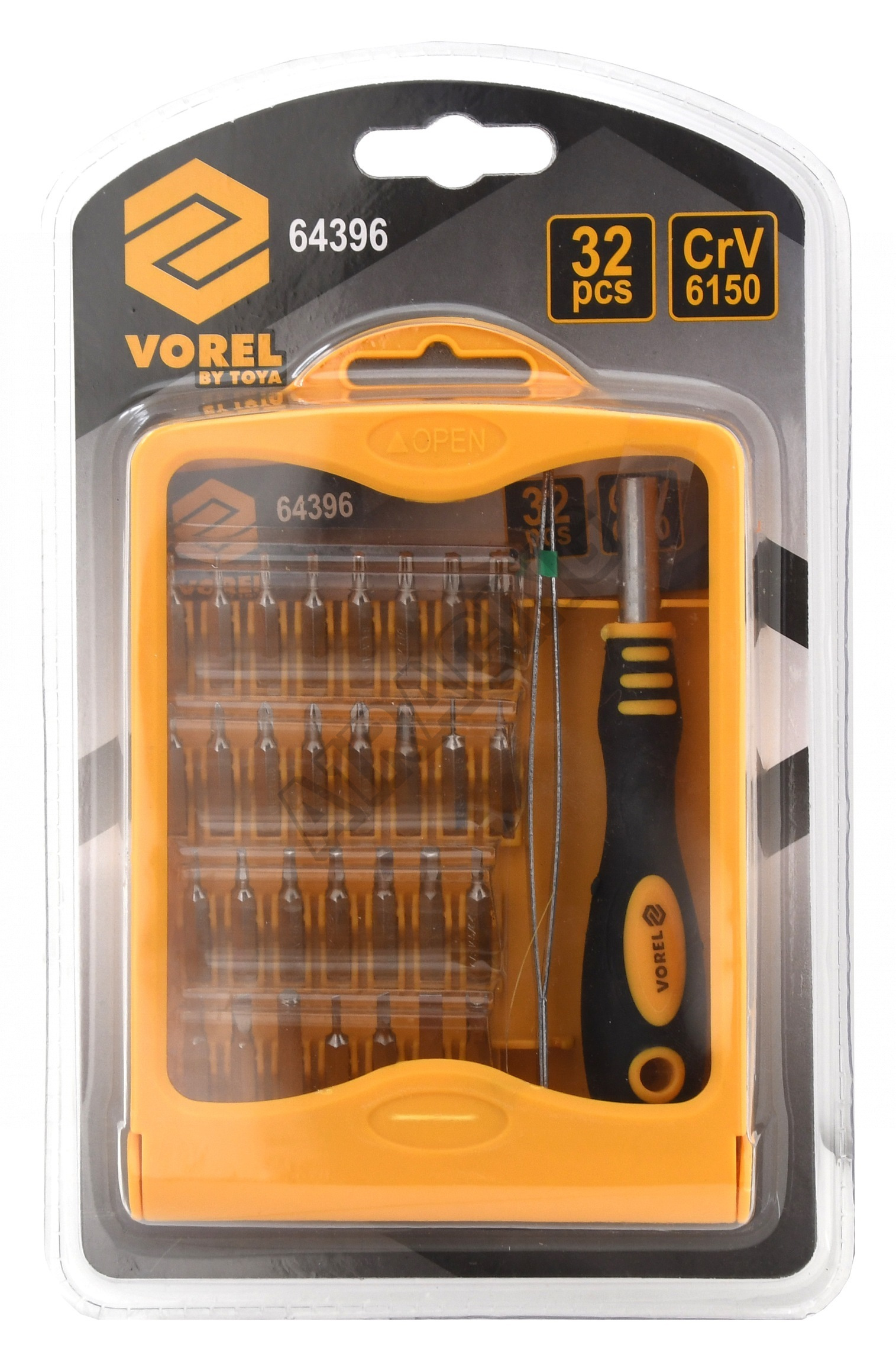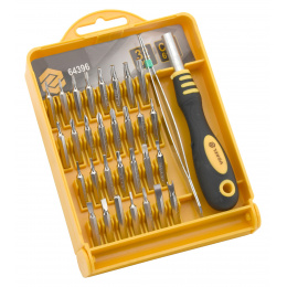Obsahuje celkem 32ks dílů: nejdrobnější bity různých provedení z kvalitní Cr-V oceli, kvalitní, ergonomický šroubovák a pinzetu.