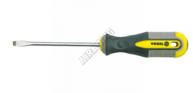 Plochý šroubovák 6x150 mm. Vyrobeno z chrom-vanadiové CrV oceli. Špička má saténový povrch, dodatečně pískovaná a magnetizovaná, což umožňuje pevné uchopení hlavy šroubu. Rukojeť je vyrobena ze dvou kompozitního plastu. Otvor v rukojeti umožňuje zavěsit šroubovák.
