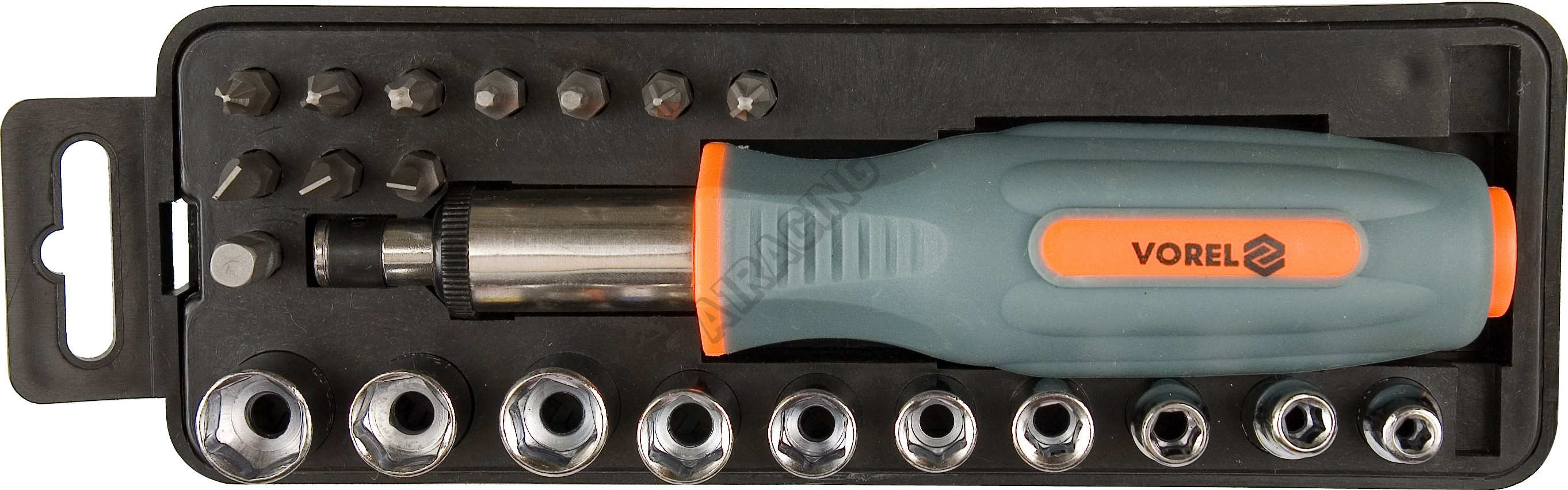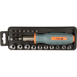 Šroubovák ráčnový s příslušenstvím 22ks vyrobené z kvalitní oceli CrV uložené v přehledném plastovém pouzdře.