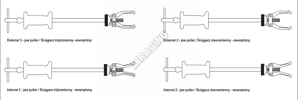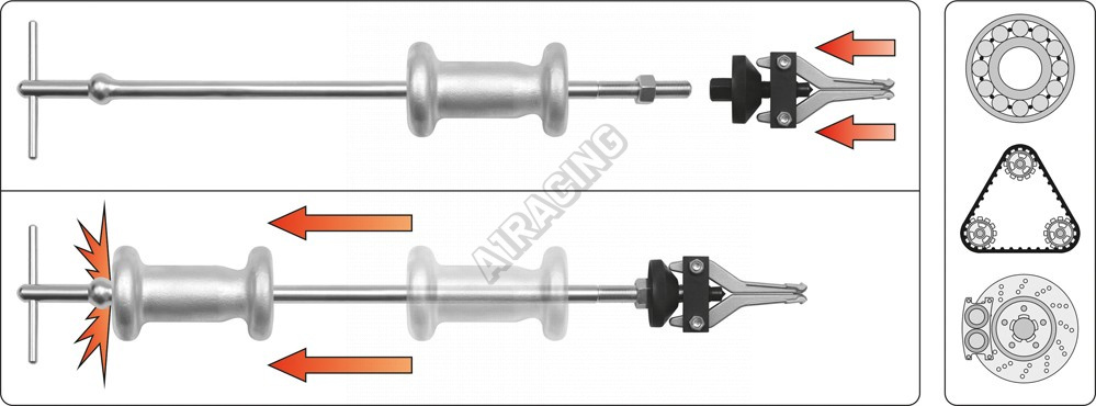 Ložiska jsou demontována údery kluzného kladiva o zarážku vodící tyče. Čelisti stahováku se zajistí na ložisku utažením kuželové matice. Stahovák je dodáván v plastovém kufru.