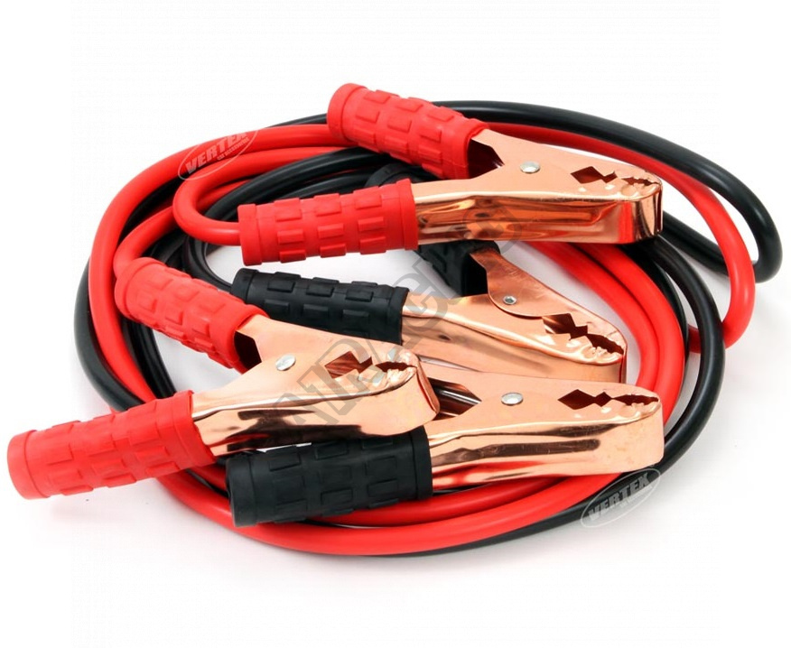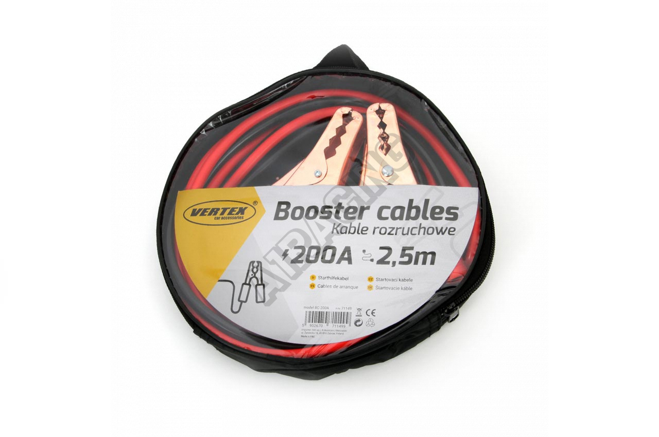 Měděné, barevně označené startovací kabely se svorkami na akumulátor. Max. proud 200 ampér, délka 2, 5 metru a průřez je 3mm2 .
