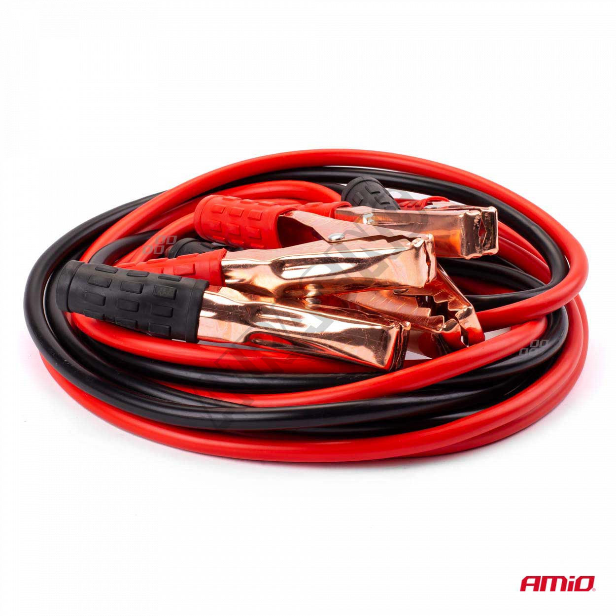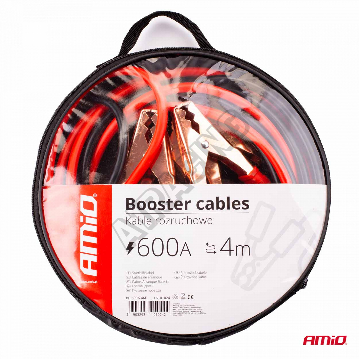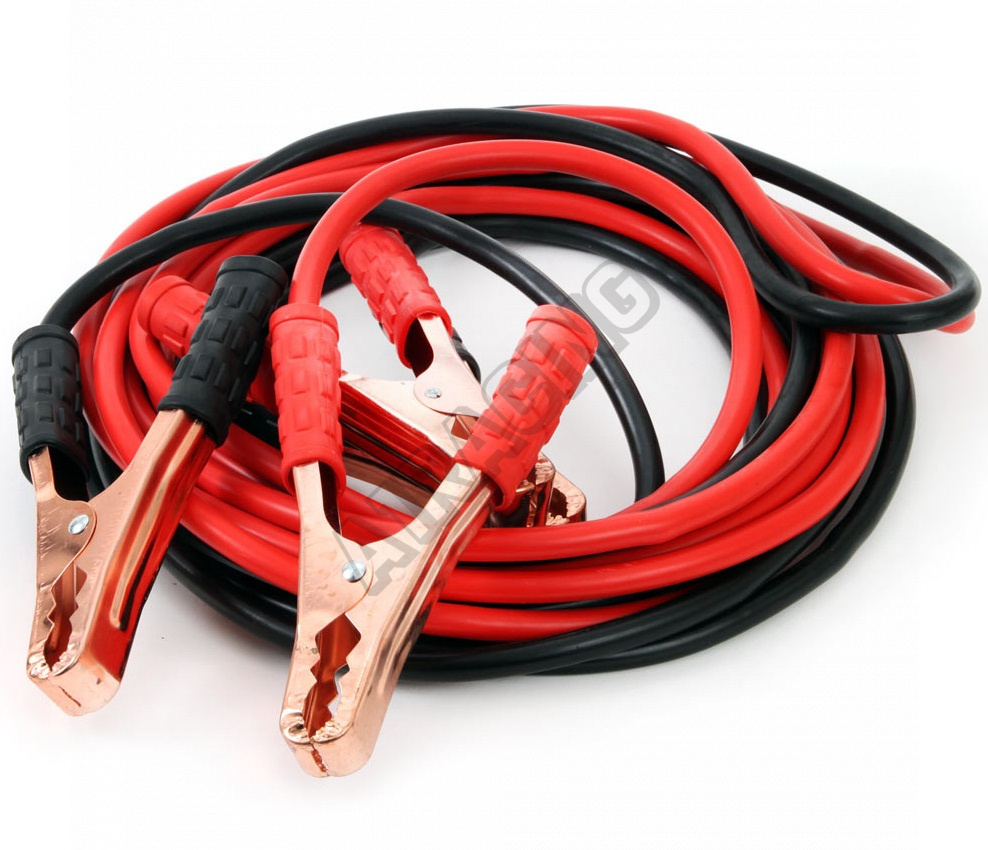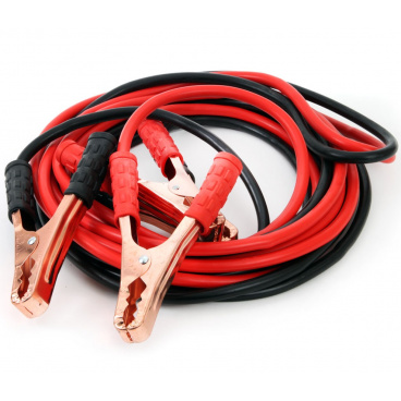 Měděné, barevně označené startovací kabely se svorkami na akumulátor. Max. proud 600 ampér, délka 4 metry .