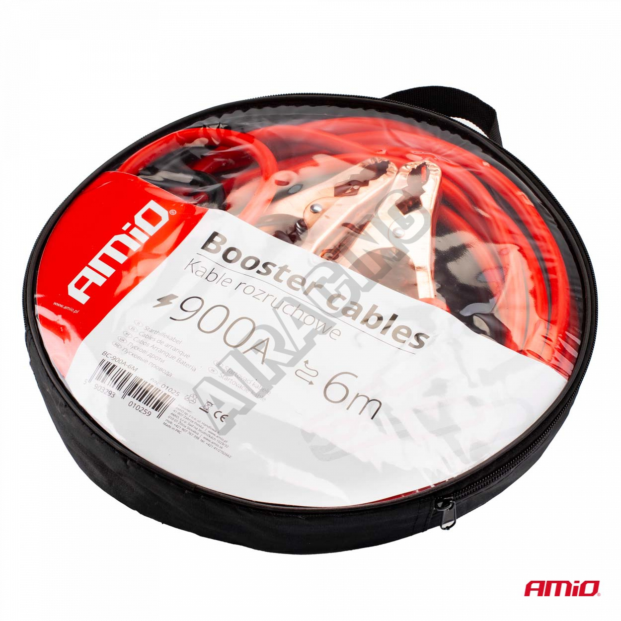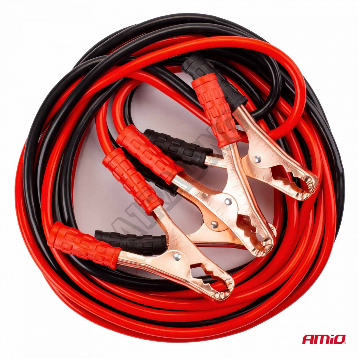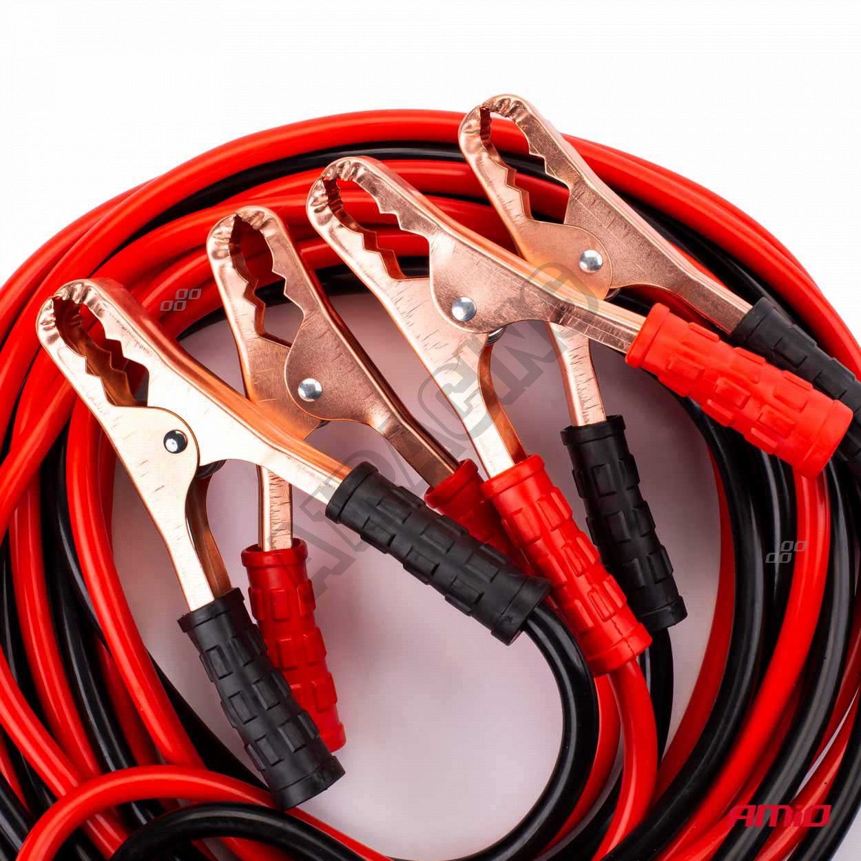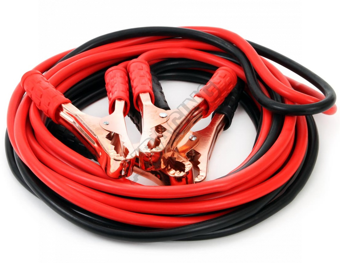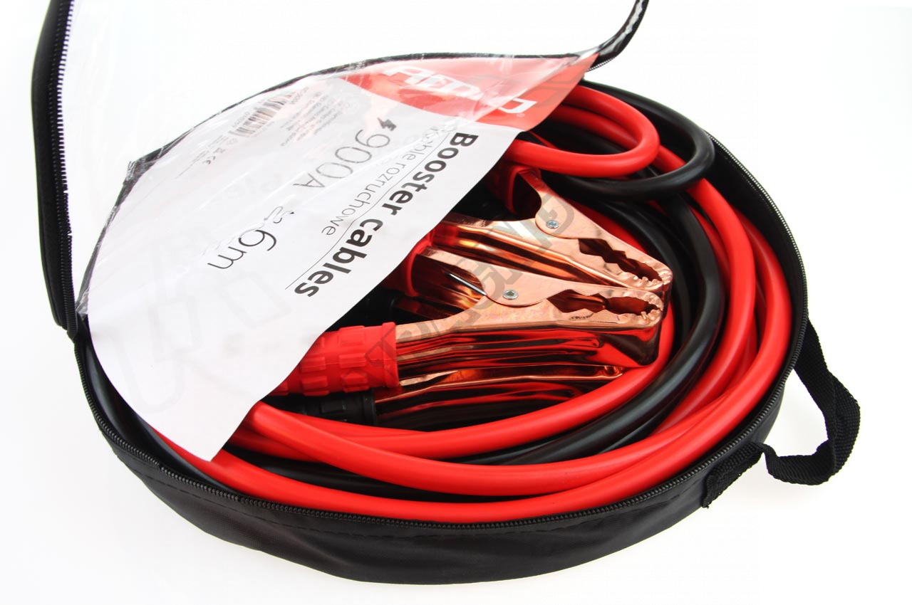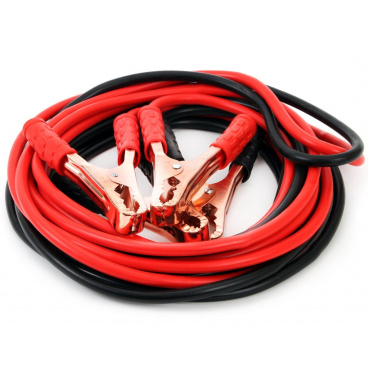 Měděné, barevně označené startovací kabely se svorkami na akumulátor. Max. proud 900 ampér, délka 6 metrů .