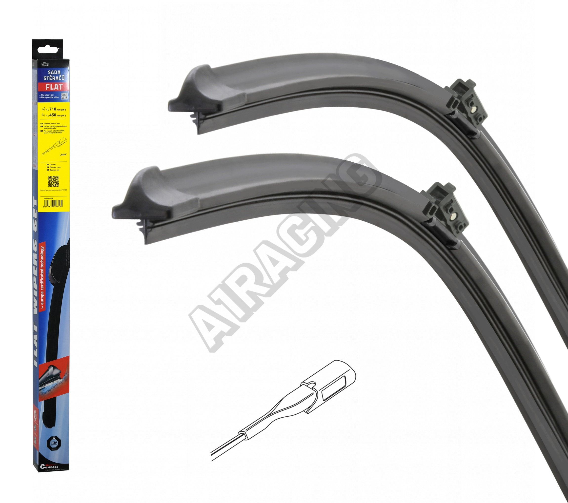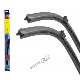 Sada dvou plochých stěračů FLAT (řidič + spolujezdec) se speciálním uchycením. Délky stěračů a systé