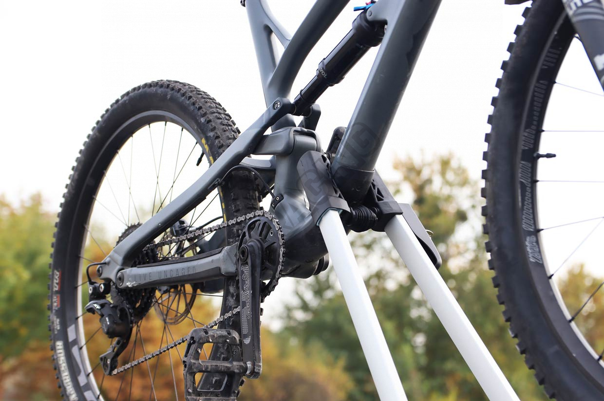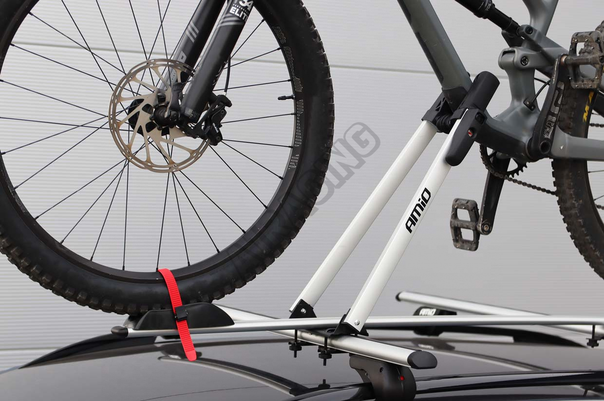 - Pevná spona účinně upevňuje rám kola v držáku, a plastové pásky zabezpečují kola