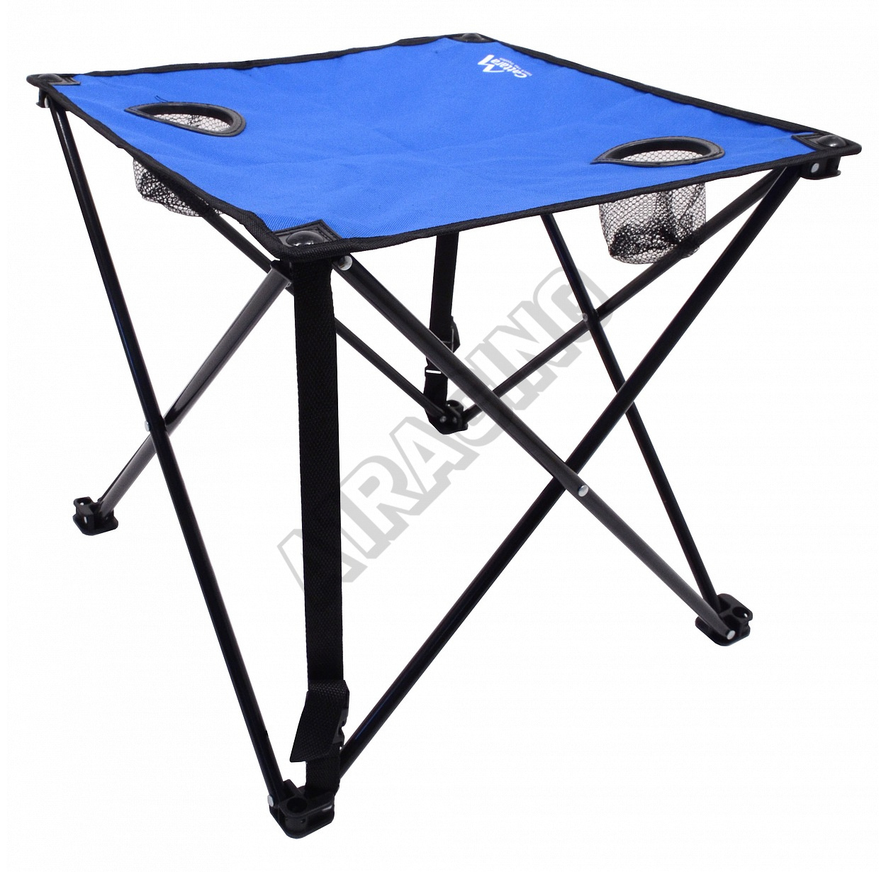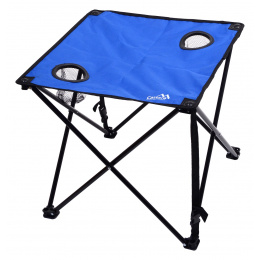 Pro napnutí plochy stolu, o rozměrech 47 x 47 cm, slouží stahovací popruhy v rozích. Samotná plocha stolu, ve výšce 45 cm, je navíc vybavena dvěma držáky na pití.