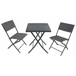 Plochy stolu i židlí jsou tvořeny odolným pleteným polyetylenem (PE) v imitaci ratanu, který je nenáročný na údržbu a vhodný pro venkovní použití. Konstrukce je vyrobena z pevného kovu, což zajišťuje dlouhou životnost a spolehlivost.