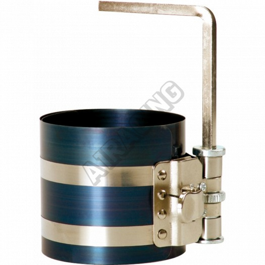 Svěrka na pístní kroužky 100 mm vysoká. Ovládání klíčem s ráčnovým mechanismem a bezpečnostní ventil spojují rychlé a bezpečné sevření se spolehlivým ovládáním. Svěrka jemně stiskne kroužky do jejich pracovní plochy, čímž sníží nebezpečí poškození komponentu při instalaci.