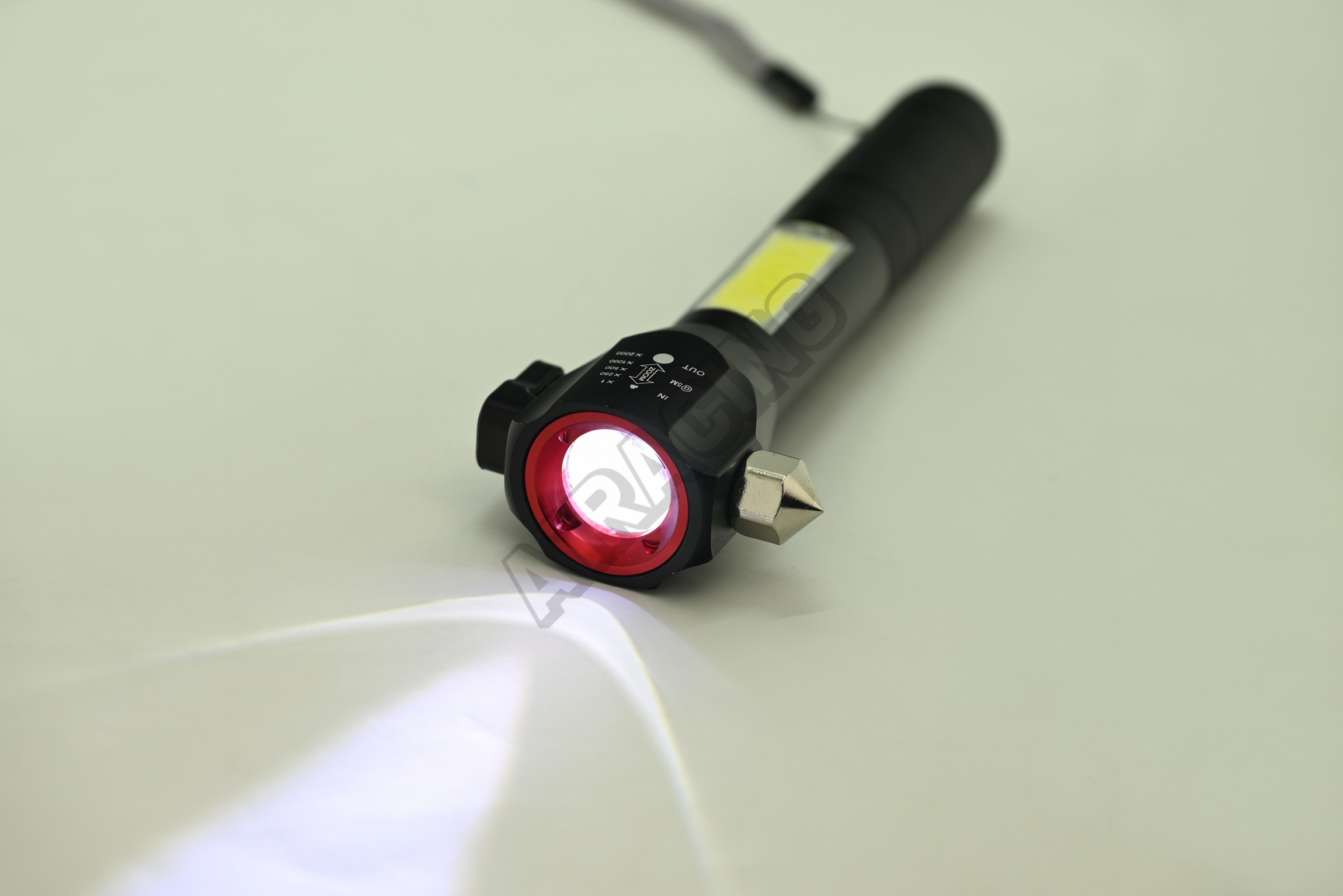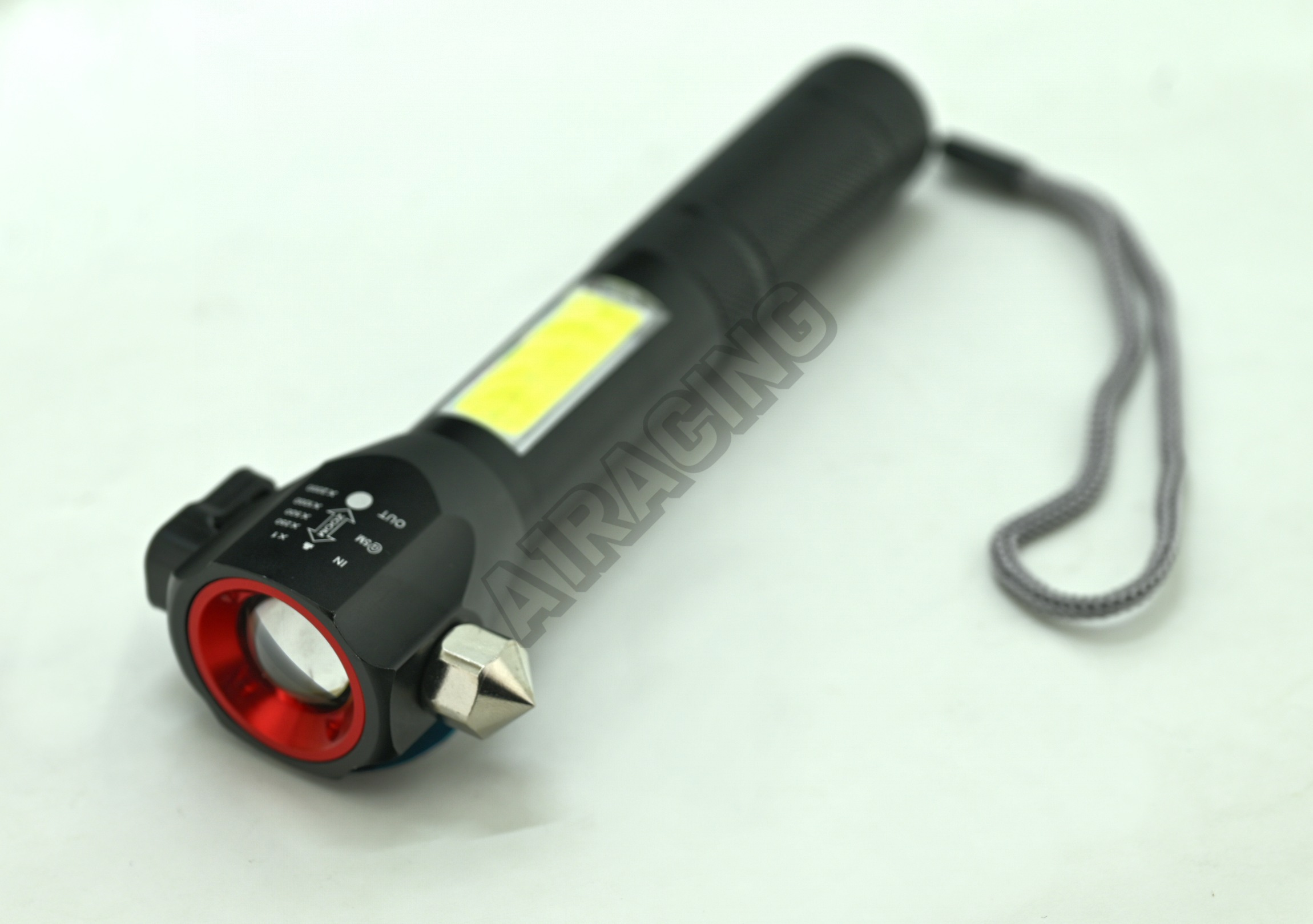 Další výbavou svítilny je řezač pásů a hrot na nouzové rozbití skla na vrchní části svítilny.