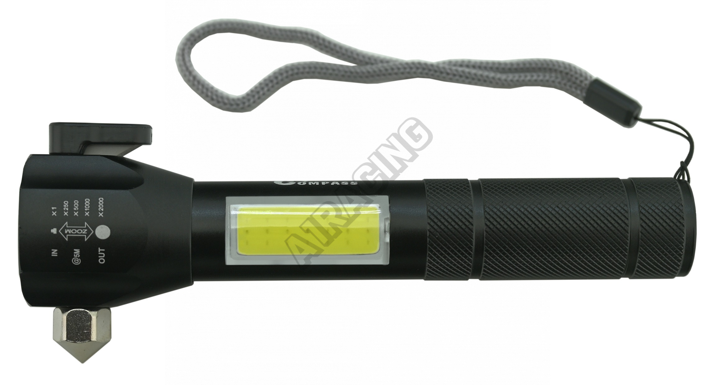 Dobíjecí LED lampa s čelním osvětlením s funkcí zoom, bočním rozptýleným COB osvětlením a užitečnými nouzovými funkcemi.