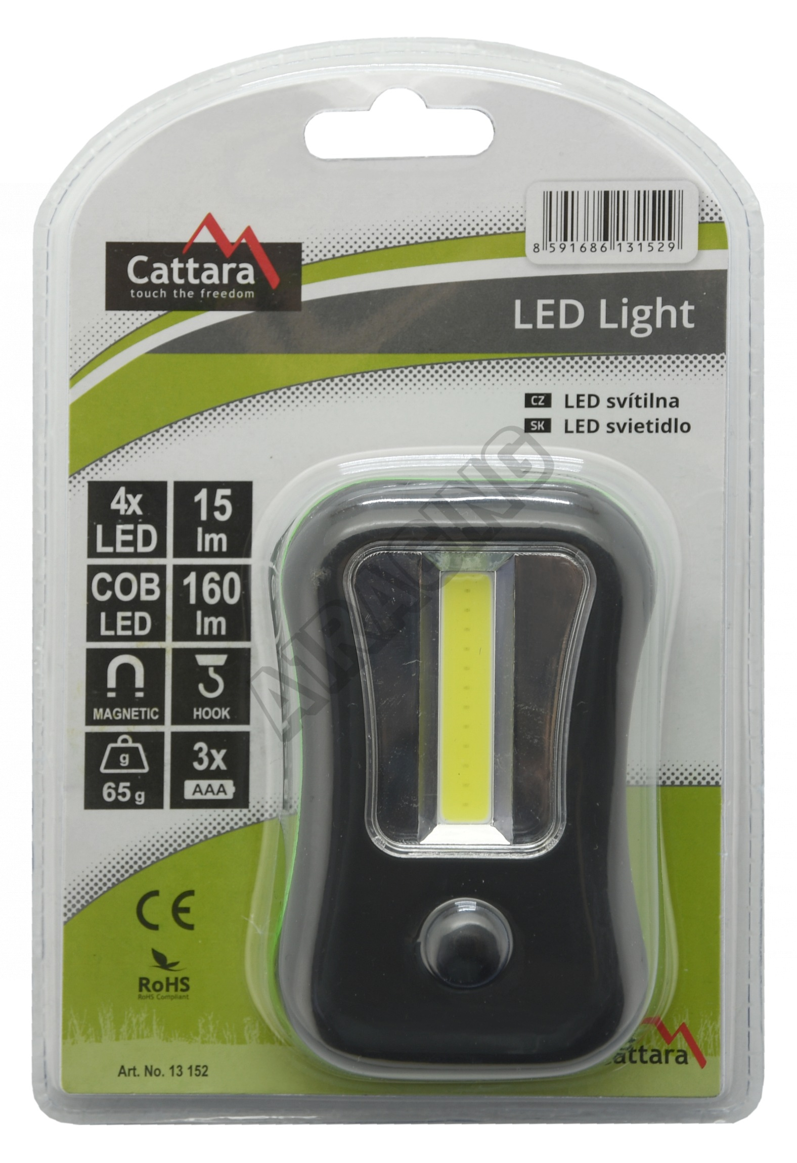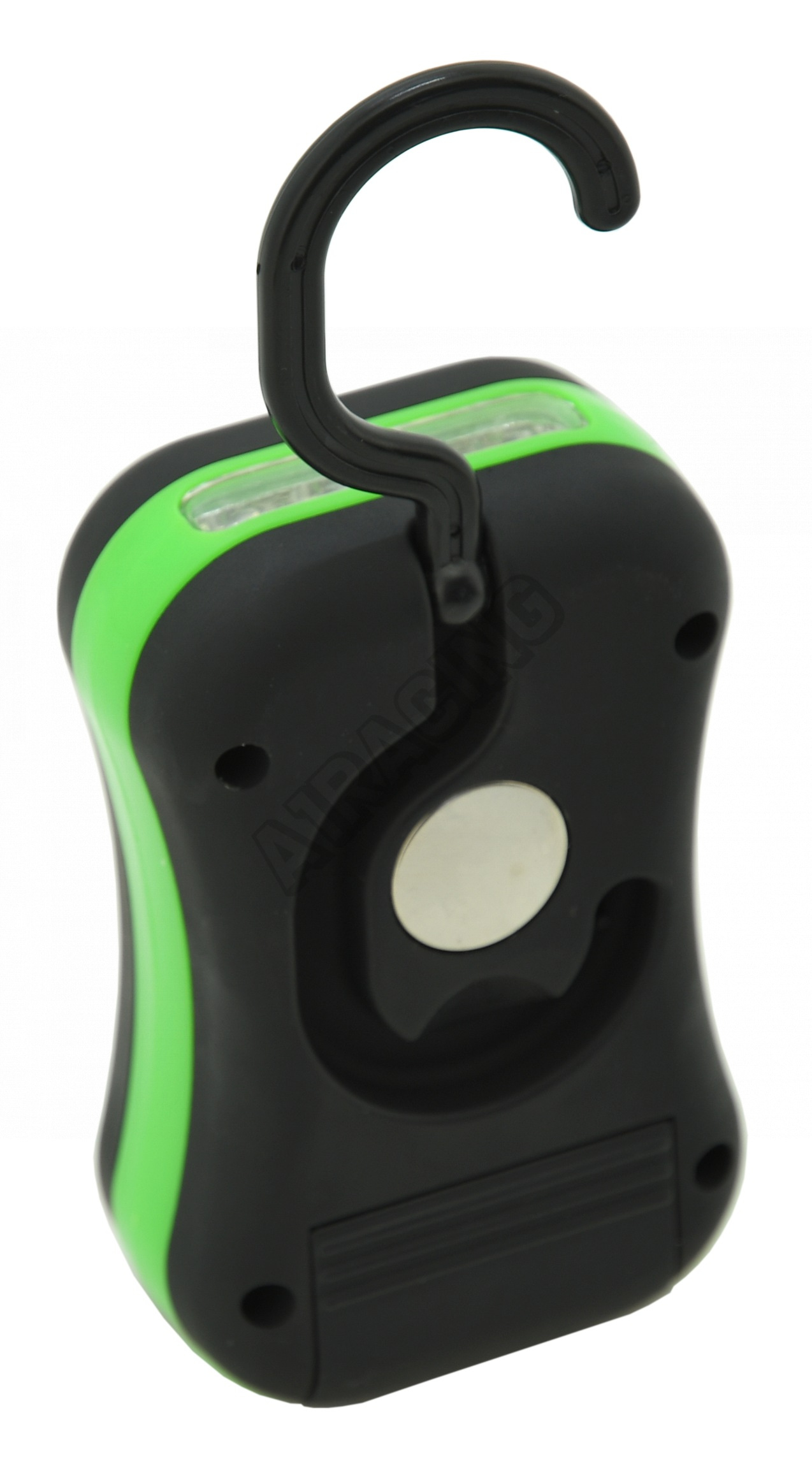 Svítilna s háčkem a magnetem pro campingové využití, například do stanu.
