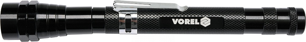 Celokovová teleskopická LED svítilna, s klipsem na opasek a s magnetem pro opevnění. Svítilna je v místě LED diod osazena magnetickým kroužkem, díky kterému lze snadno vytáhnout kovové předměty (např. šroubky) i z nepřístupných míst.