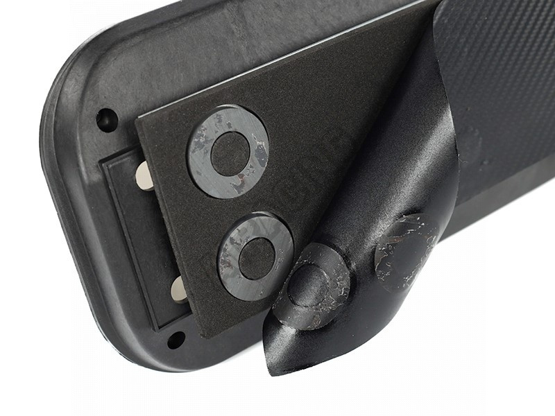 Pevná magnetická základna je chráněna materiálem, který nepoškrábe střechu vozu, ke kterému je připevněn. Napájeno ze zásuvky zapalovače cigaret.