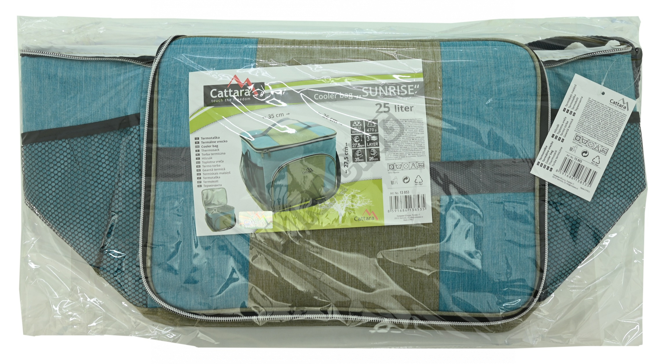 Taška je vyrobena z polyesteru, s vnitřní ALU izotermickou vrstvou s celkovými rozměry 35 x 26 x 27,5 cm.