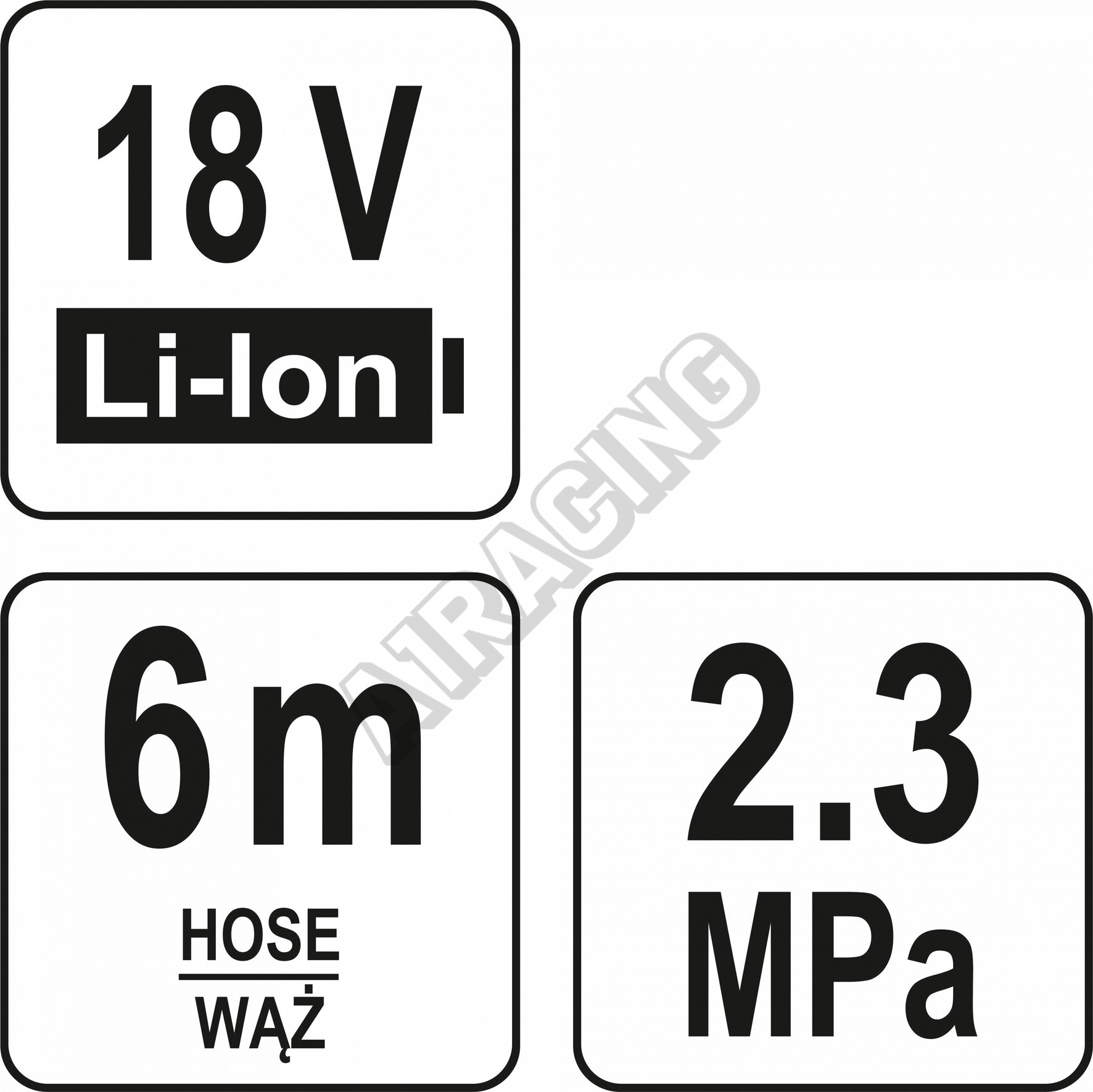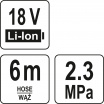 Tlakový čistič na baterie 18 V vybavená revolverovou tryskou a rozprašovačem pěny. Díky funkci nasávání tekutiny může fungovat jako zařízení pro zalévání zahrady, mytí zabláceného kola apod. vodou z kbelíku nebo řeky. Hrot má spojku bajonetového typu, což je nejoblíbenější řešení na trhu a je kompatibilní s příslušenstvím jiných výrobců tlakových myček.
