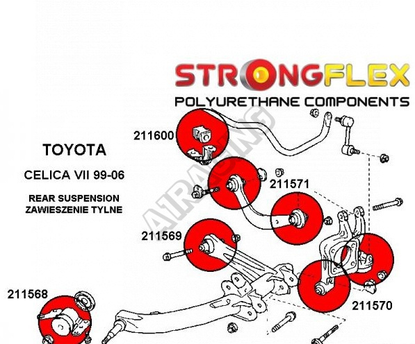 Toyota Celica VII 1999-06 StrongFlex (tvrdost 80ShA) kompletní sestava silentbloků na celé auto obsahuje :