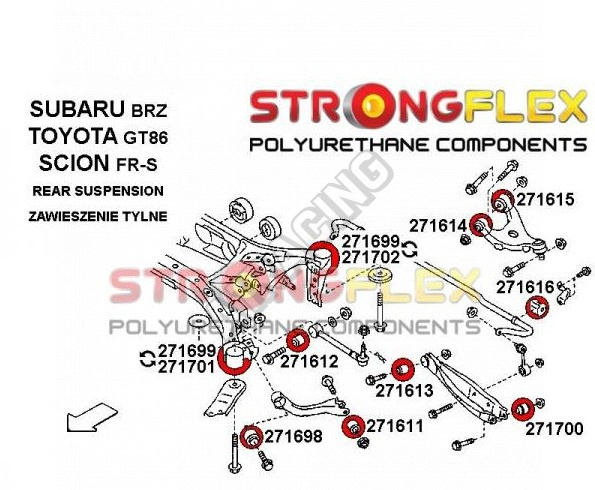 Toyota GT86 StrongFlex Sport (tvrdost 90ShA) kompletní sestava silentbloků na celé auto obsahuje :