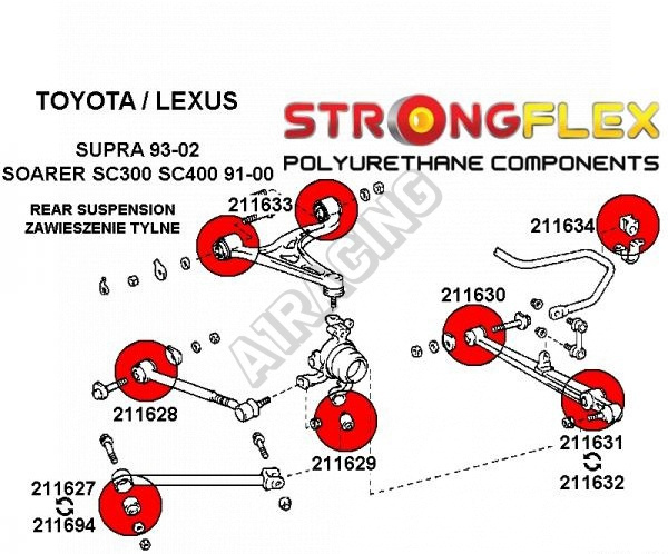 Toyota Supra StrongFlex (tvrdost 80ShA) kompletní sestava silentbloků na celé auto obsahuje :