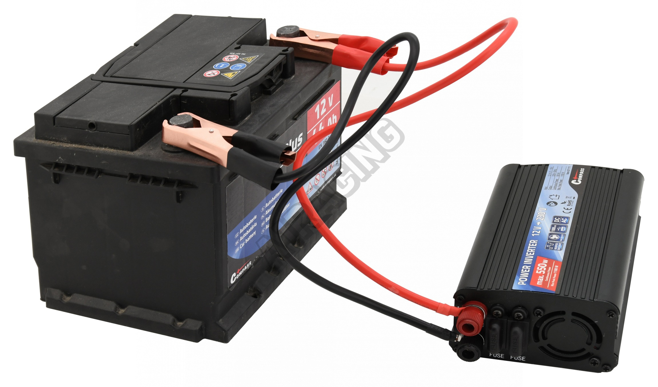 Připojení napájecího napětí je řešeno zástrčkou do zásuvky automobilového zapalovače 12V, nebo pomocí klipsů z akumulátoru 12V.