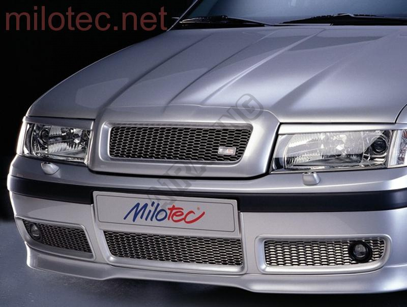 Třídílná sportovní mřížka Milotec s mlhovými světly Hella pro přední nárazník je vyrobena z tahokovu z ušlechtilé nerezavějící oceli. Rám mřížky je vyroben z černého ABS předurčeného pro lakování do barvy vozu.