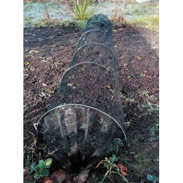 Ochranný tunel pro rostliny z černé polyesterové síťoviny.