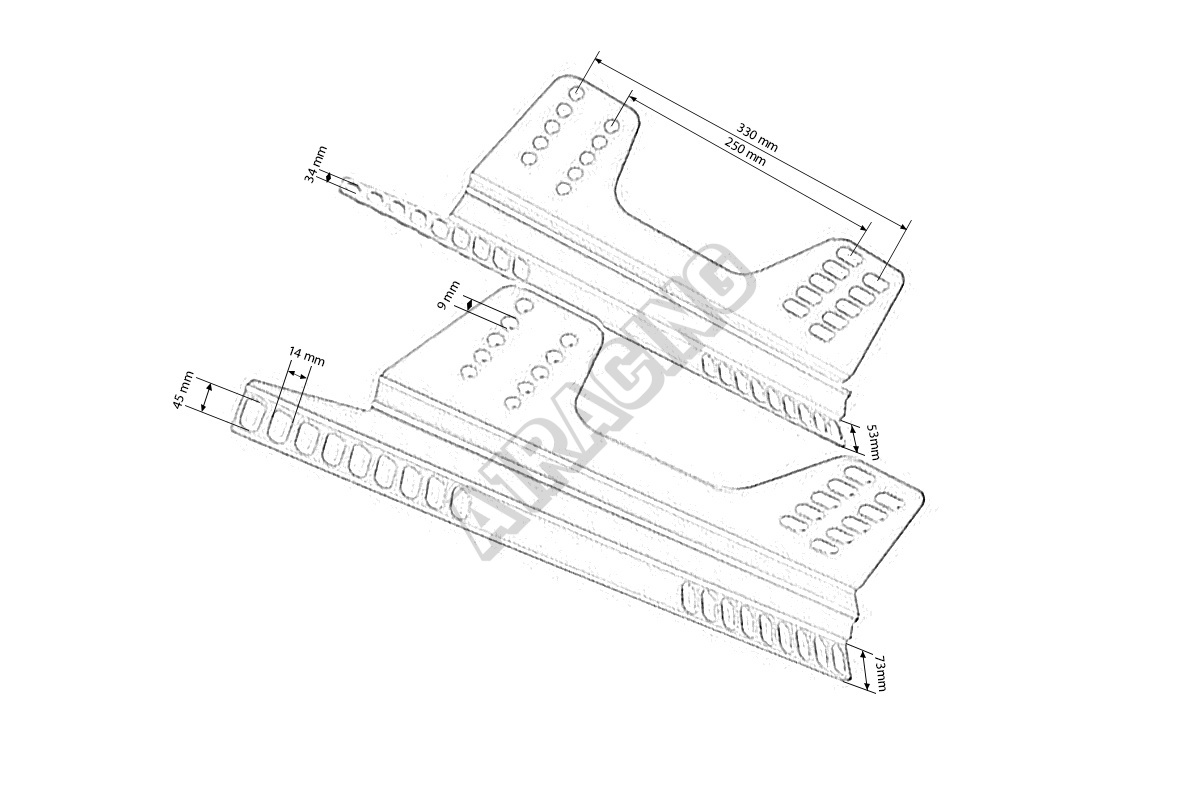 Upevnění jsou vyrobena z oceli o tloušťce 3 mm, ohýbaná na CNC ohraňovacích lisech a dodatečně zesílena speciálně navrženým prolisem. V závěrečné fázi výroby nalakováno práškovou barvou na černo.