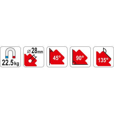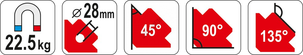 Umožňuje přesné spojování materiálů v úhlech 45°, 90° a 135°. Nosnost magnetu cca 22,5 kg. Povrchová úprava červené práškové lakování. Tento má navíc otvor pro montáž válcových součástí, jako jsou trubky a tyče, o průměru až 28 mm.