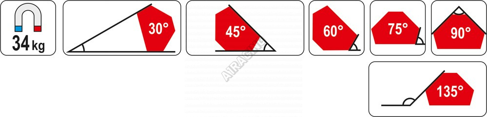 Umožňuje přesné spojování materiálů v úhlech 30°, 45°, 60°, 75°, 90° a 135°. Nosnost magnetu cca 34 kg. Povrchová úprava červené práškové lakování.
