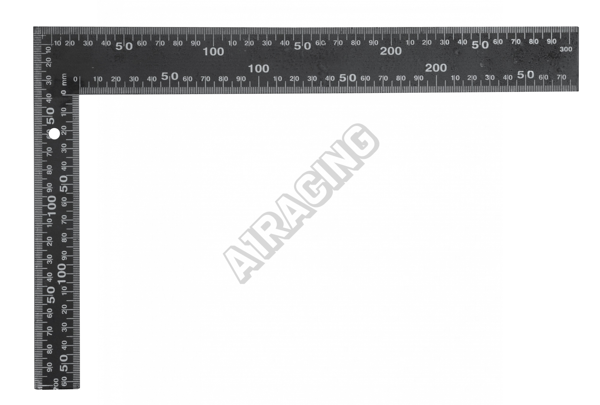 Truhlářský úhelník, vyrobený z tlustého plechu, natřený černě, s jasnou bílou milimetrovou stupnicí na jedné straně a palcovou stupnicí na druhé straně.