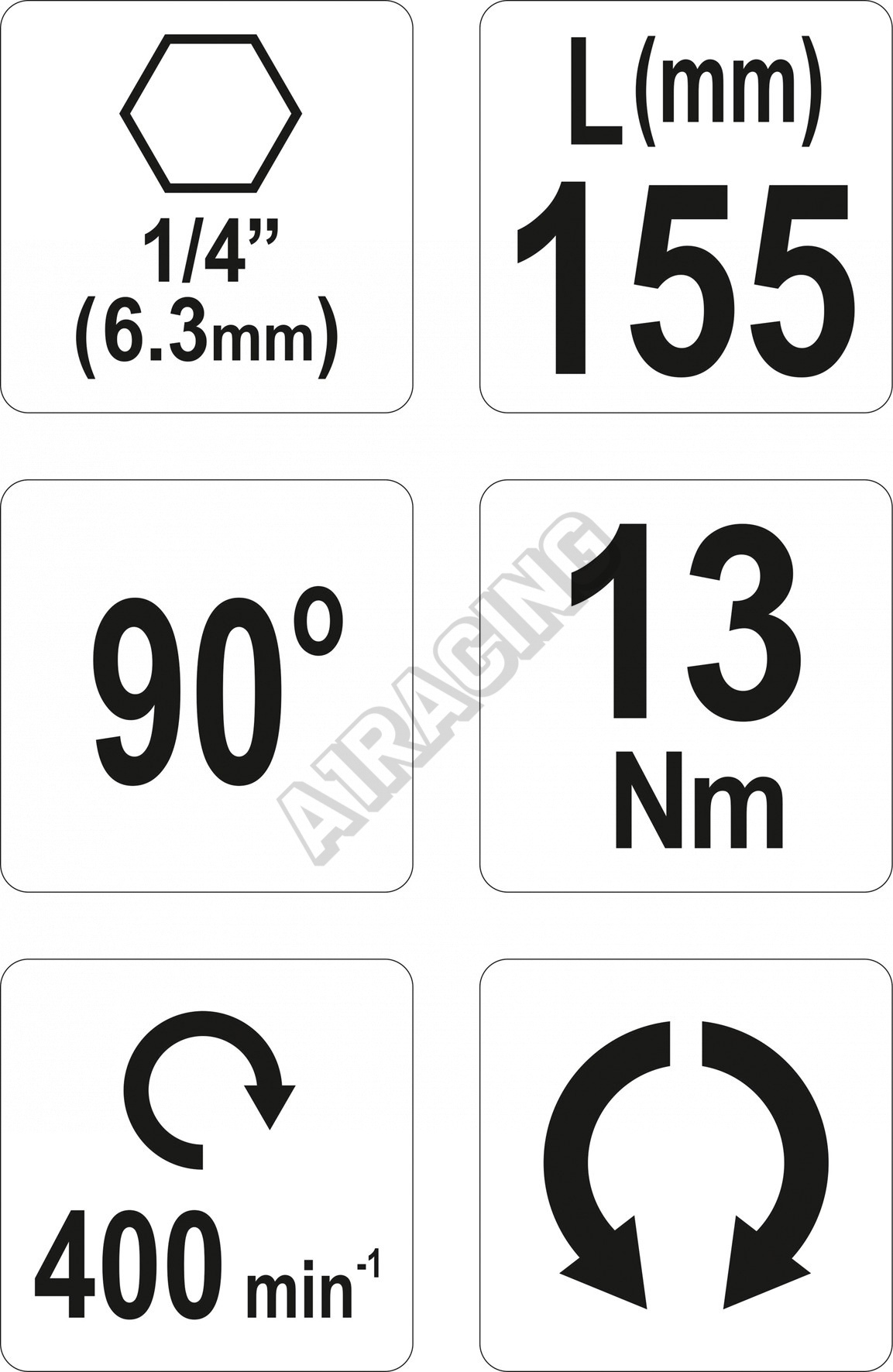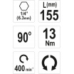 Adaptér má délku 155 mm s úhlem náklonu 90° a je vyroben z uhlíkové oceli s plastovým opláštěním. Zařízení je konstrouvané pro maximální točivý moment 13Nm a max. otáčky 400/min.
