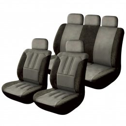 Univerzální potahy na přední a zadní sedadla včetně 5ks opěrek hlavy. • Lze použít na sedadla s airbagy. • Složení svrchního materiálu: 100% Polyester • Barva: černá/šedá