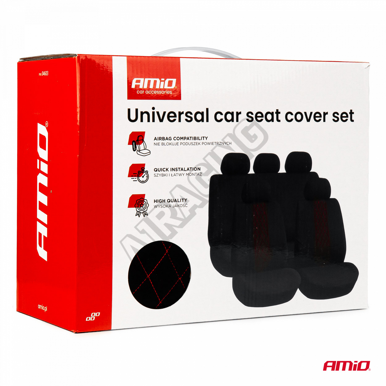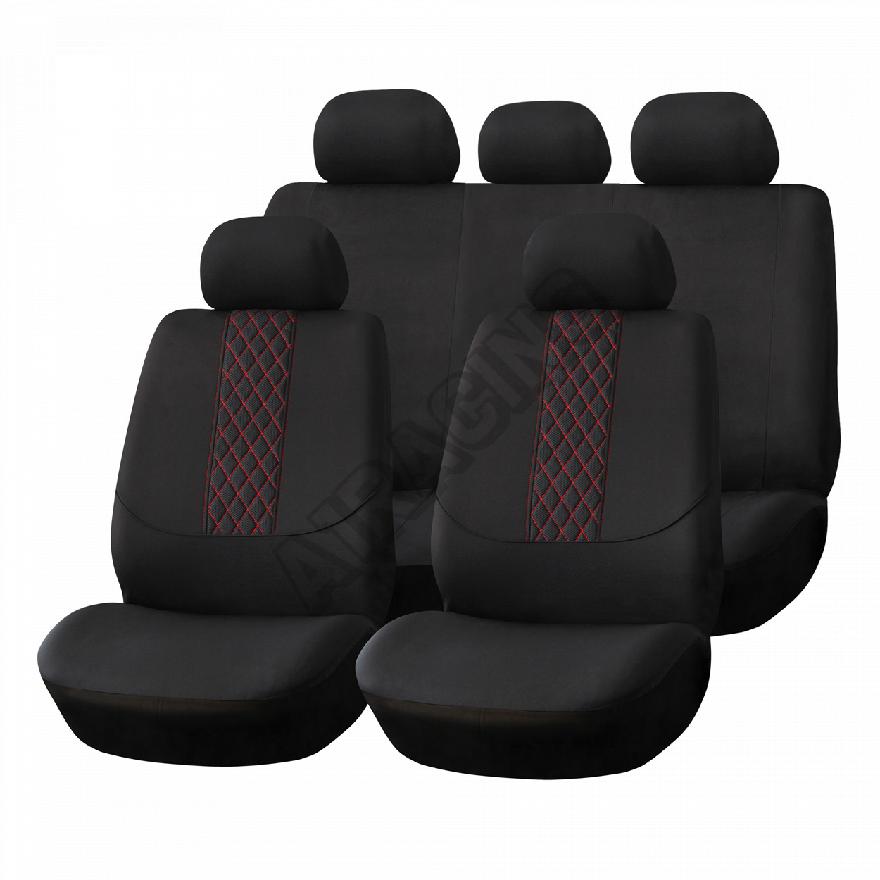 Sada 9 kusů zahrnuje potahy na dvě přední sedadla, dělenou zadní lavici a sadu opěrek hlavy. Univerzální přizpůsobení pro většinu modelů osobních automobilů.