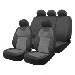 Sada 9 kusů zahrnuje potahy na dvě přední sedadla, dělenou zadní lavici a sadu opěrek hlavy. Univerzální přizpůsobení pro většinu modelů osobních automobilů.
