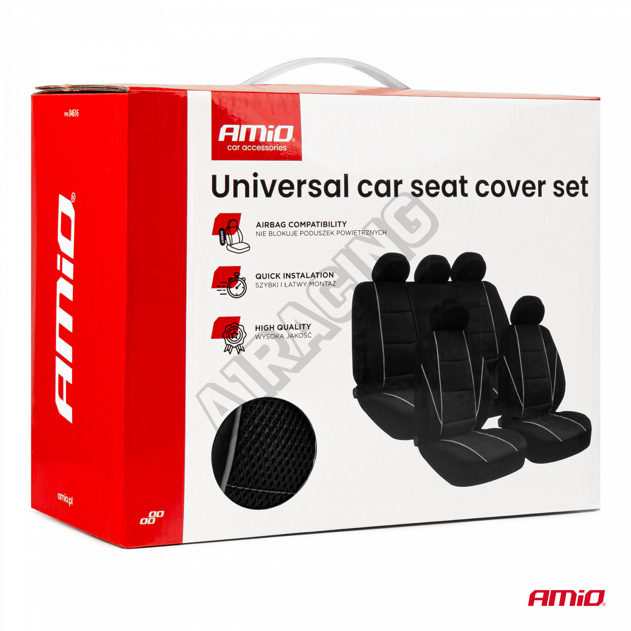 Sada 9 kusů zahrnuje potahy na dvě přední sedadla, dělenou zadní lavici a sadu opěrek hlavy. Univerzální přizpůsobení pro většinu modelů osobních automobilů.