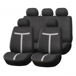 Sada 9 kusů zahrnuje potahy na dvě přední sedadla, dělenou zadní lavici a sadu opěrek hlavy. Univerzální přizpůsobení pro většinu modelů osobních automobilů.