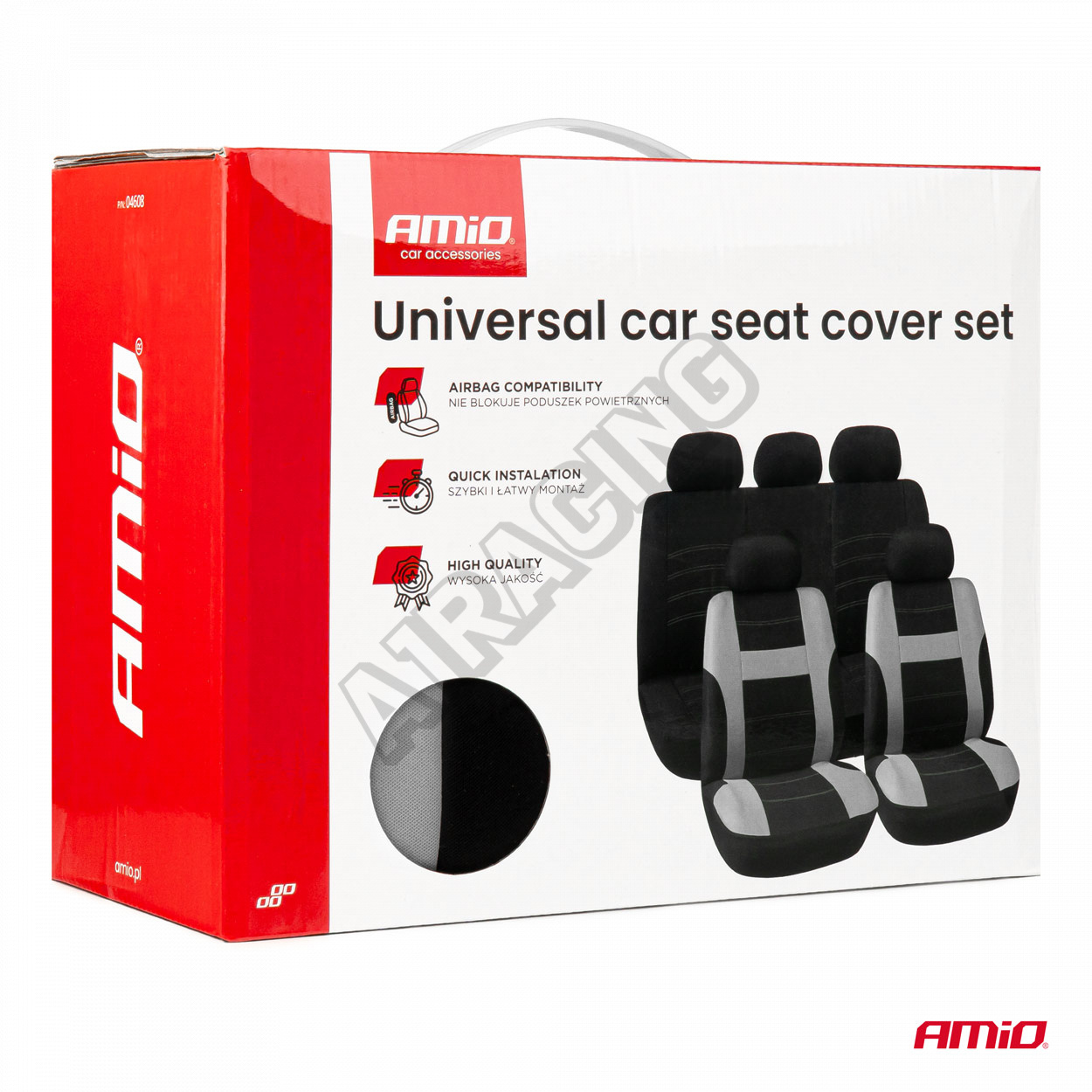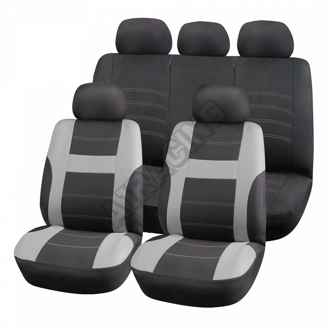 Sada 9 kusů zahrnuje potahy na dvě přední sedadla, dělenou zadní lavici a sadu opěrek hlavy. Univerzální přizpůsobení pro většinu modelů osobních automobilů.